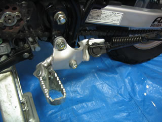 スタンドも取り付けて、これでやっと自立ができるAPEくん。 | マフラーを取り付けます。古いガスケットを取り外します。 |